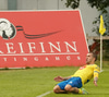 Sveinn Margeir reynir skot á lofti rétt fyrir utan teig, en hittir boltann illa og hann fer víðsfjarri markinu.