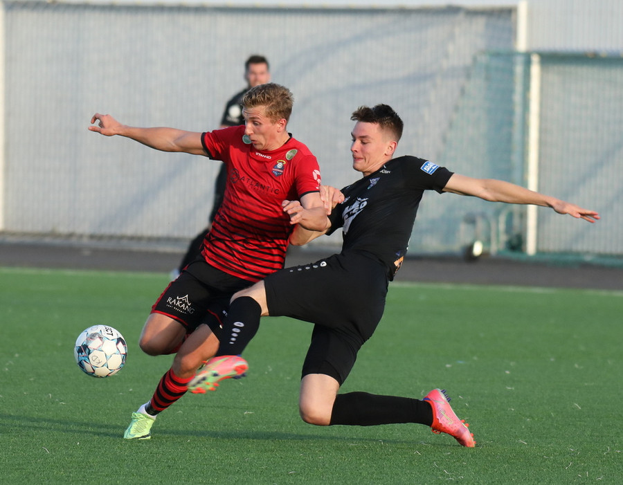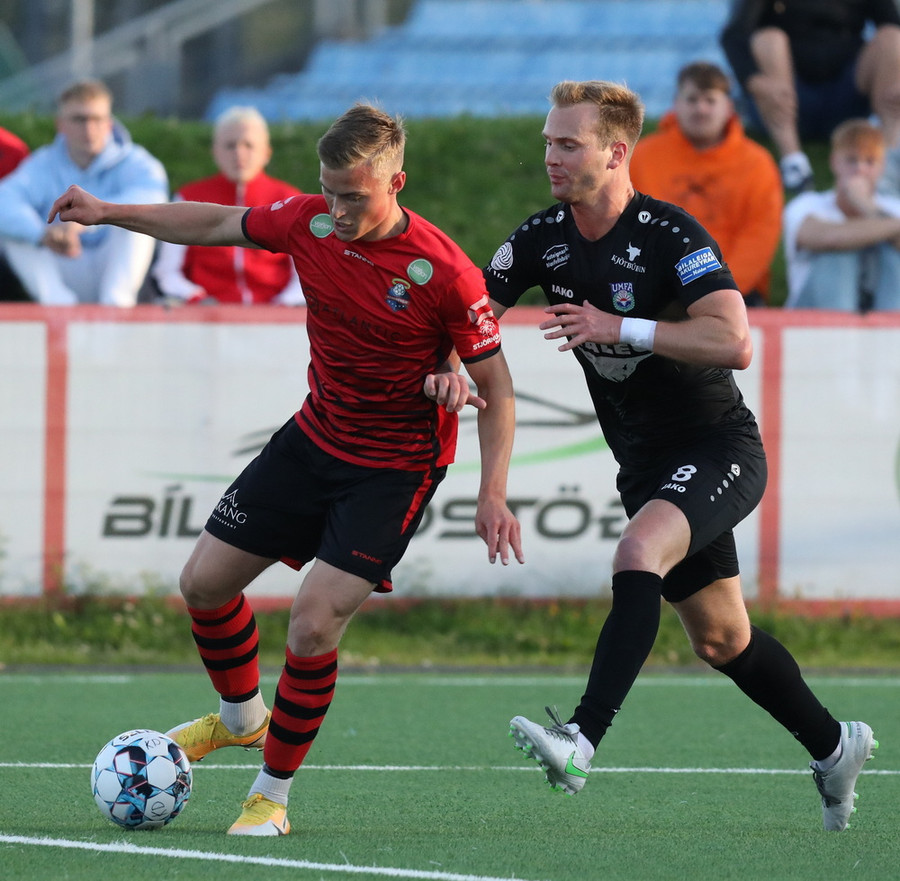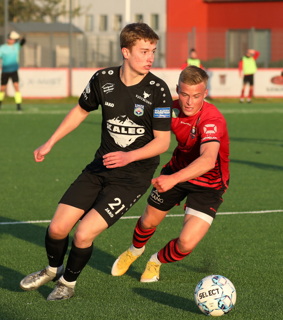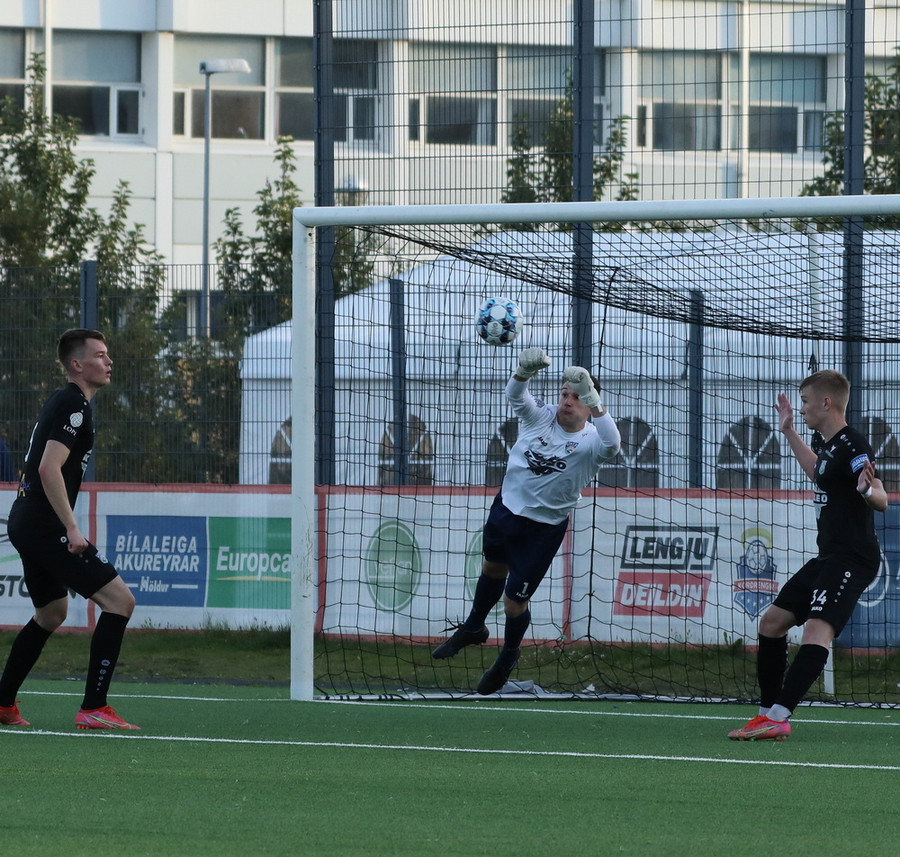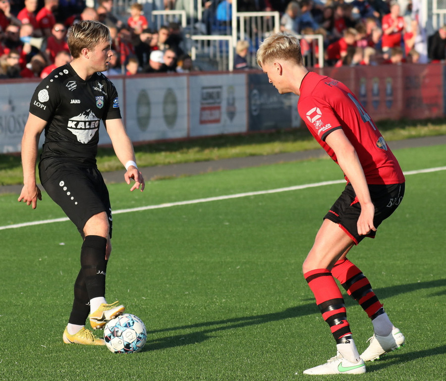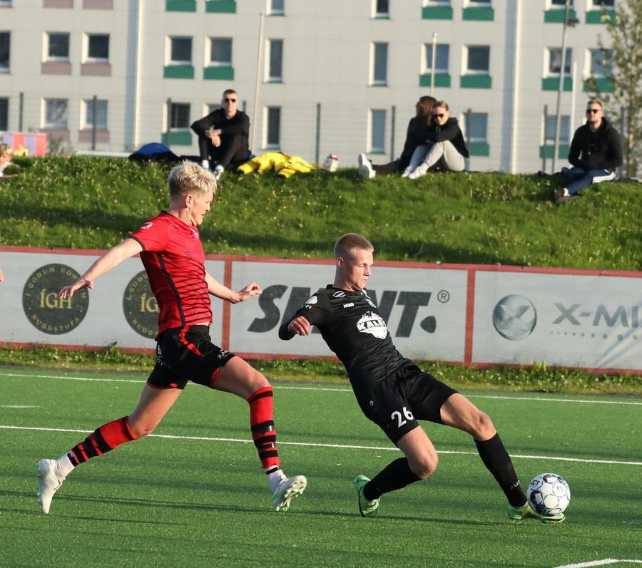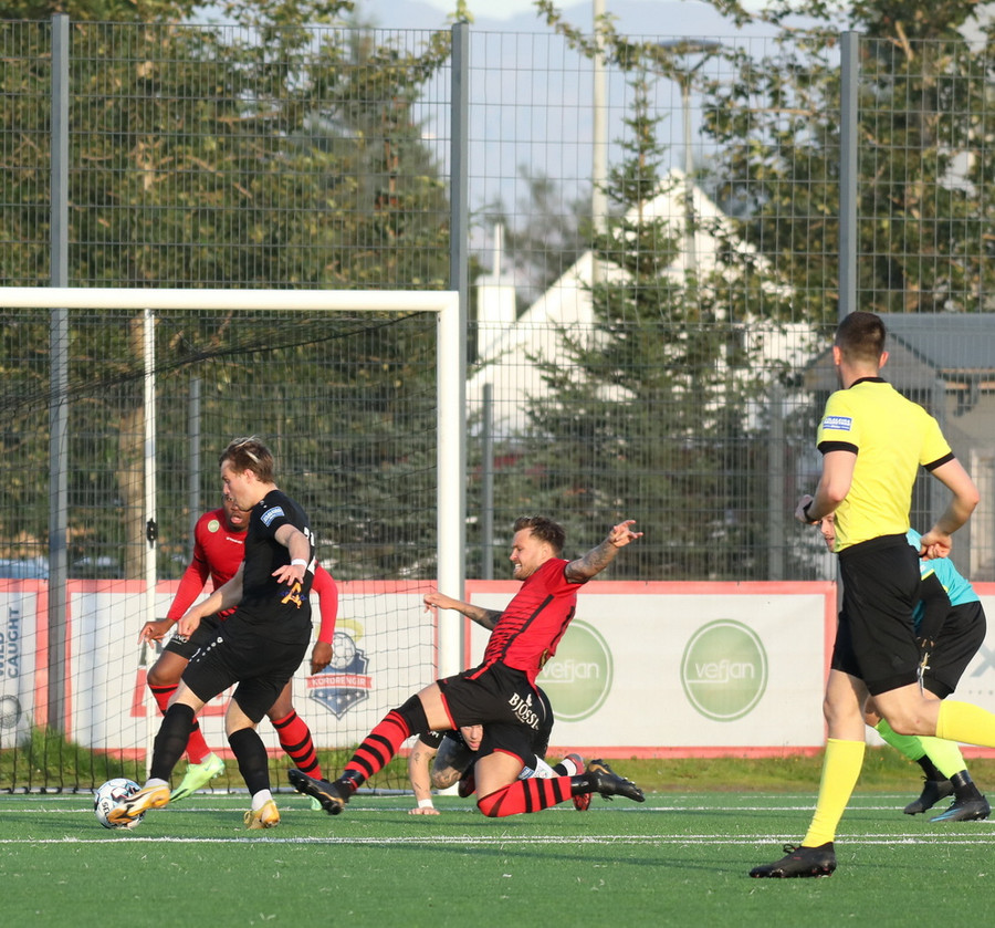 Alveg eins og í markinu kemur Hákon upp hægri kantinn en setur hann núna inn fyrir vorn gestana en Þórir missir boltann frá sér og Tanis tekur hann föstum tökum.