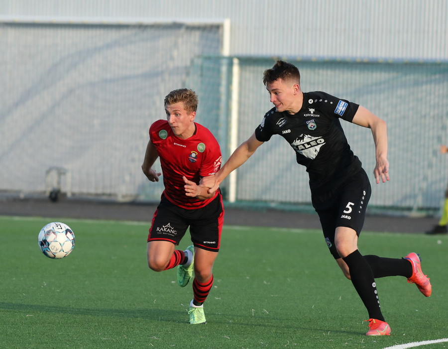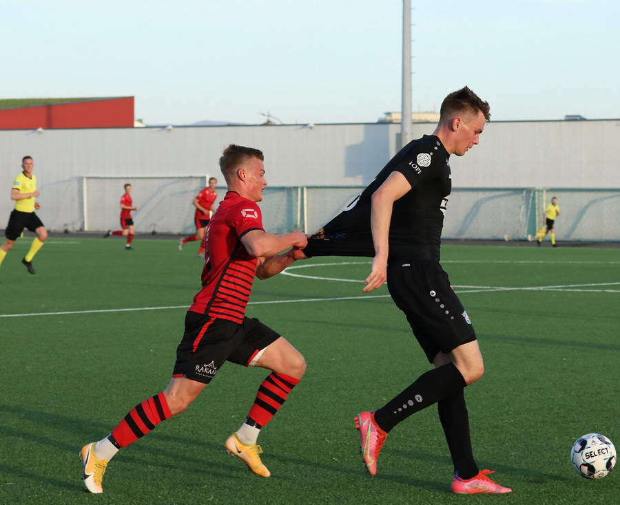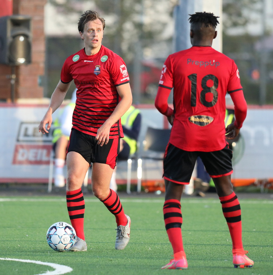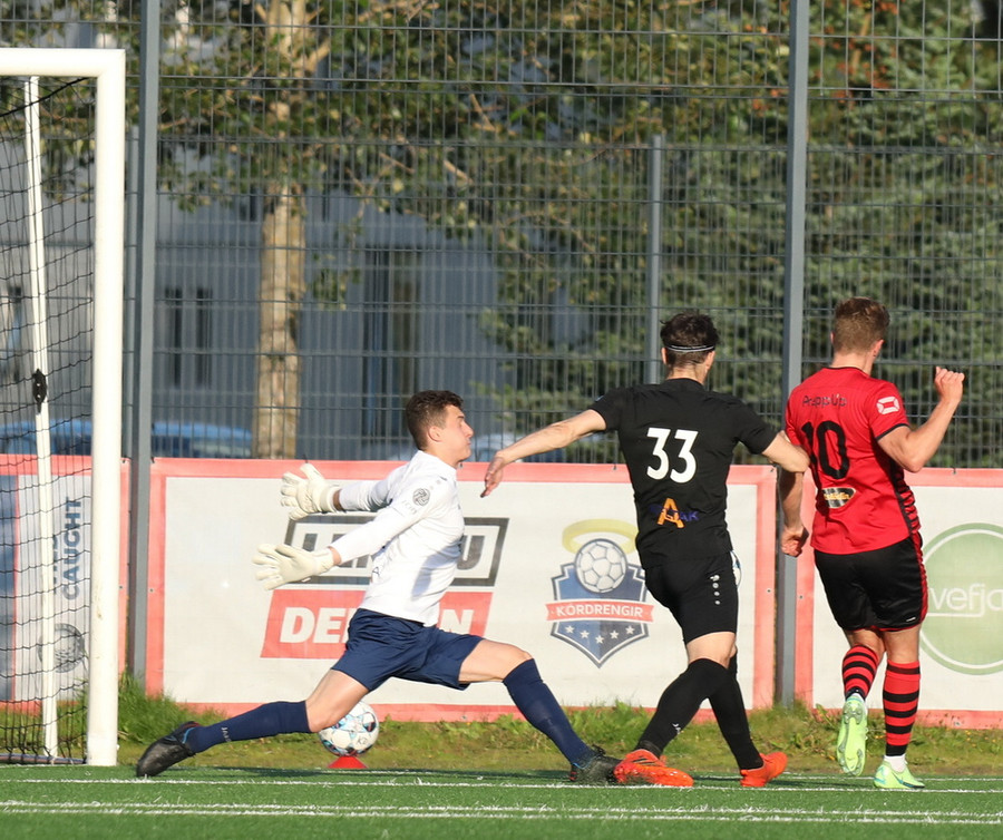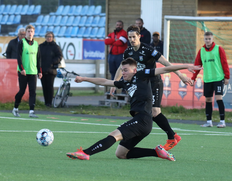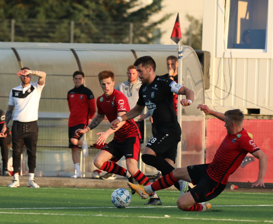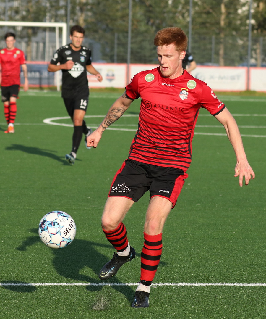 Alveg eins og í markinu kemur Hákon upp hægri kantinn en setur hann núna inn fyrir vorn gestana en Þórir missir boltann frá sér og Tanis tekur hann föstum tökum.