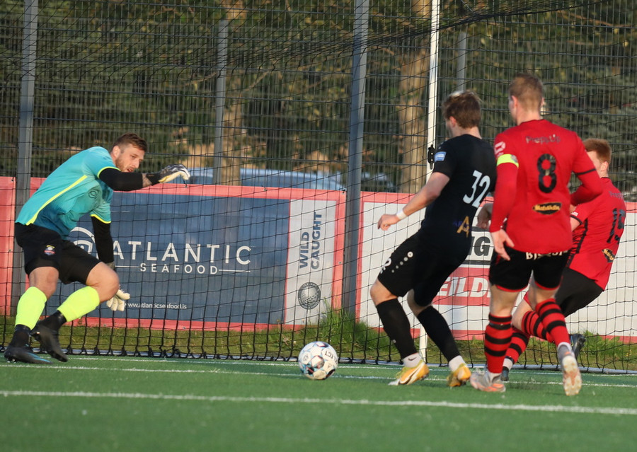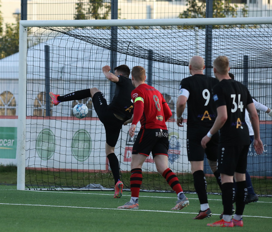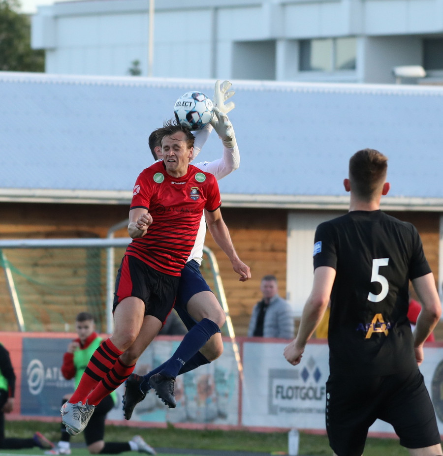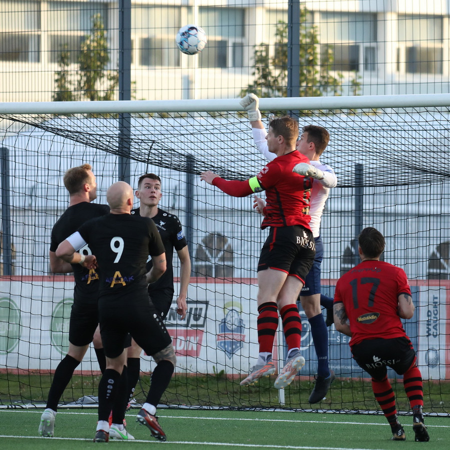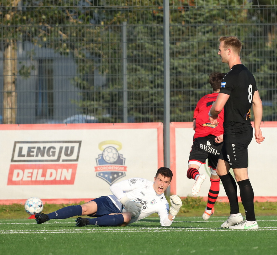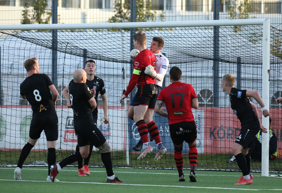 Sendingin fyrir frá vinstri kanti frá gestunum er á leiðinni á markið en Alexander Pedersen slær boltann í hornspyrnu.