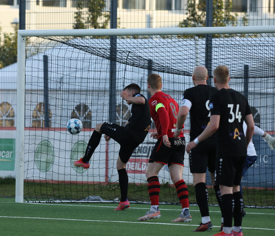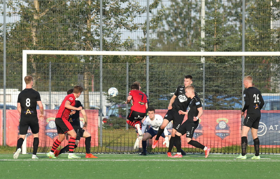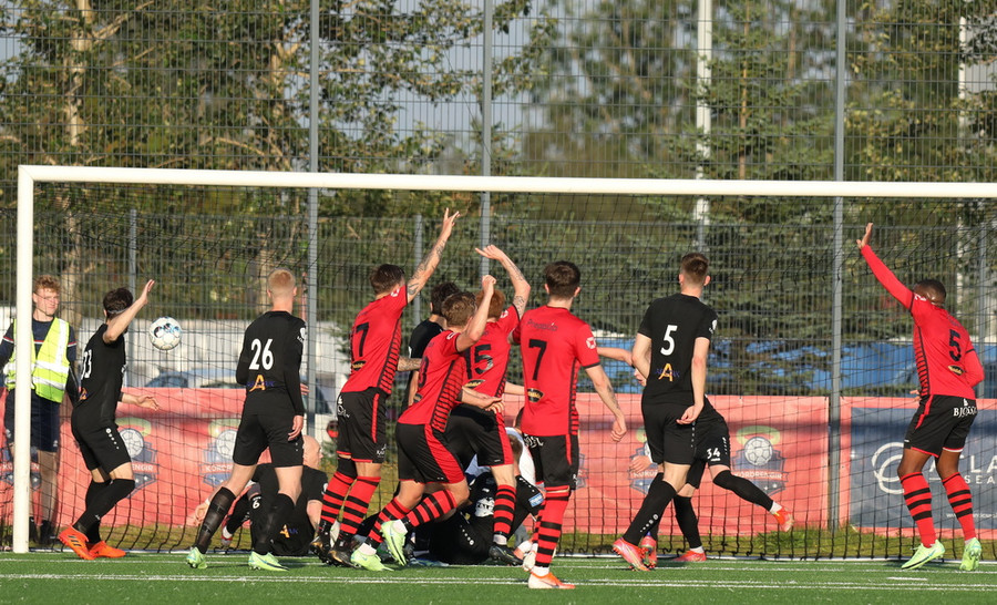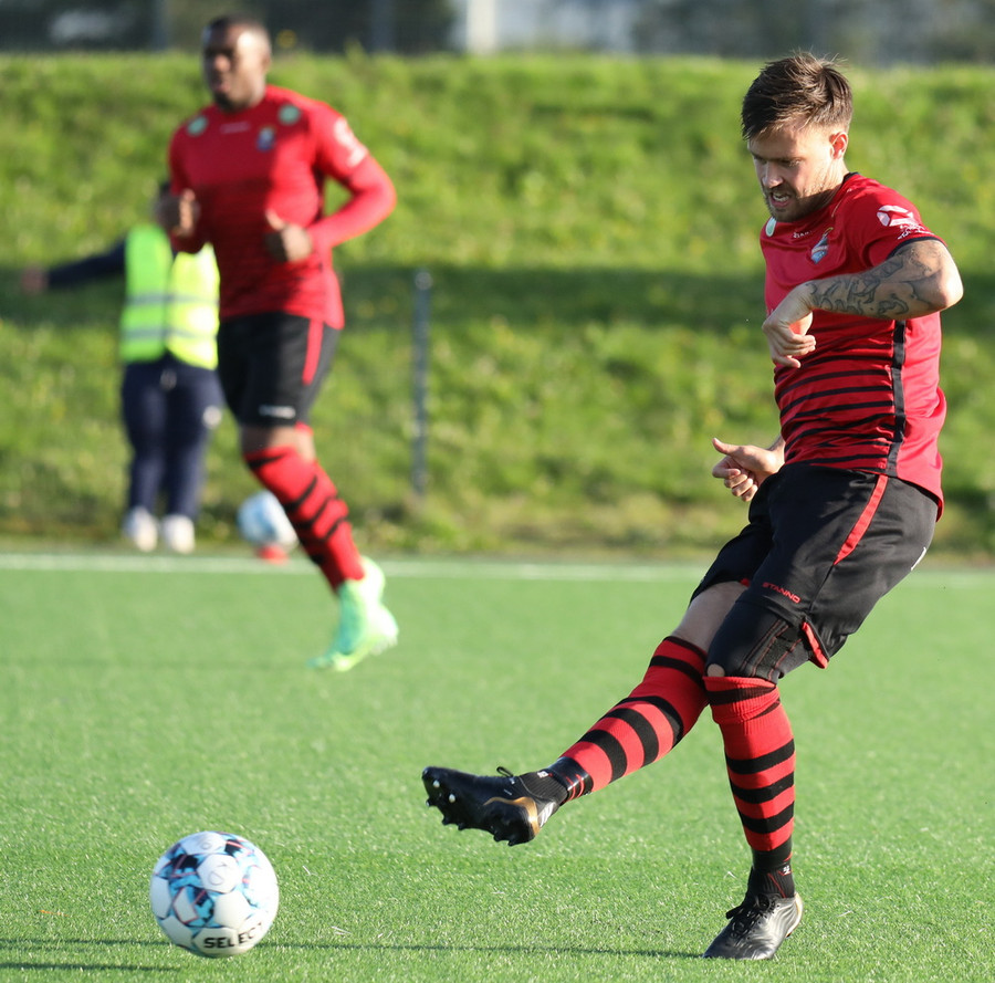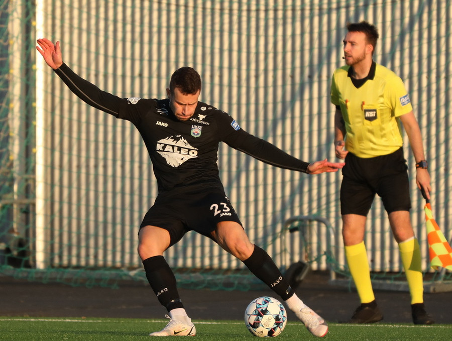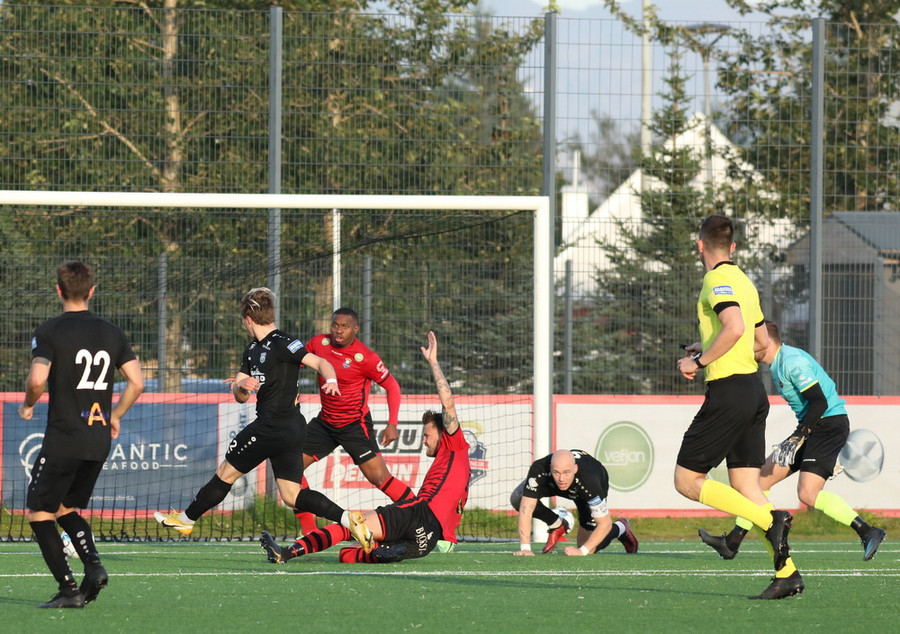 Sendingin fyrir frá vinstri kanti frá gestunum er á leiðinni á markið en Alexander Pedersen slær boltann í hornspyrnu.
