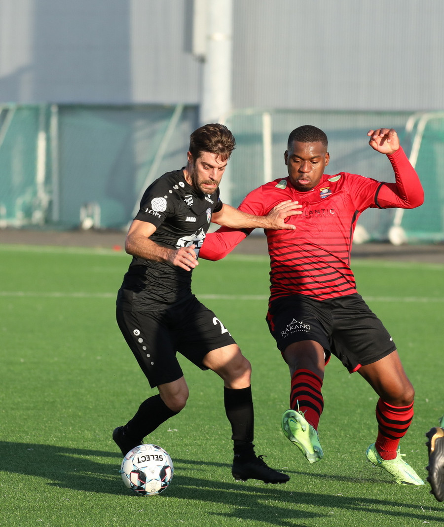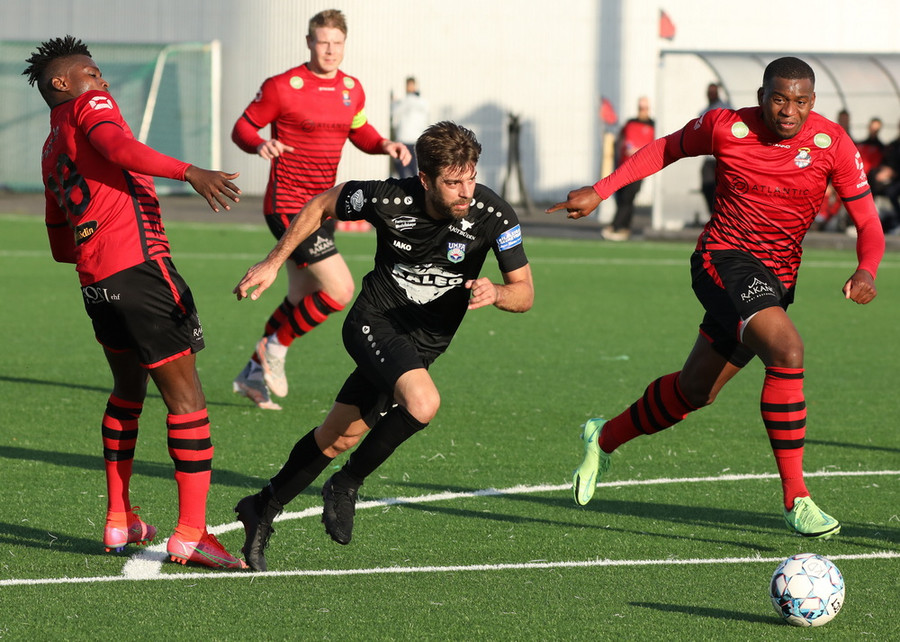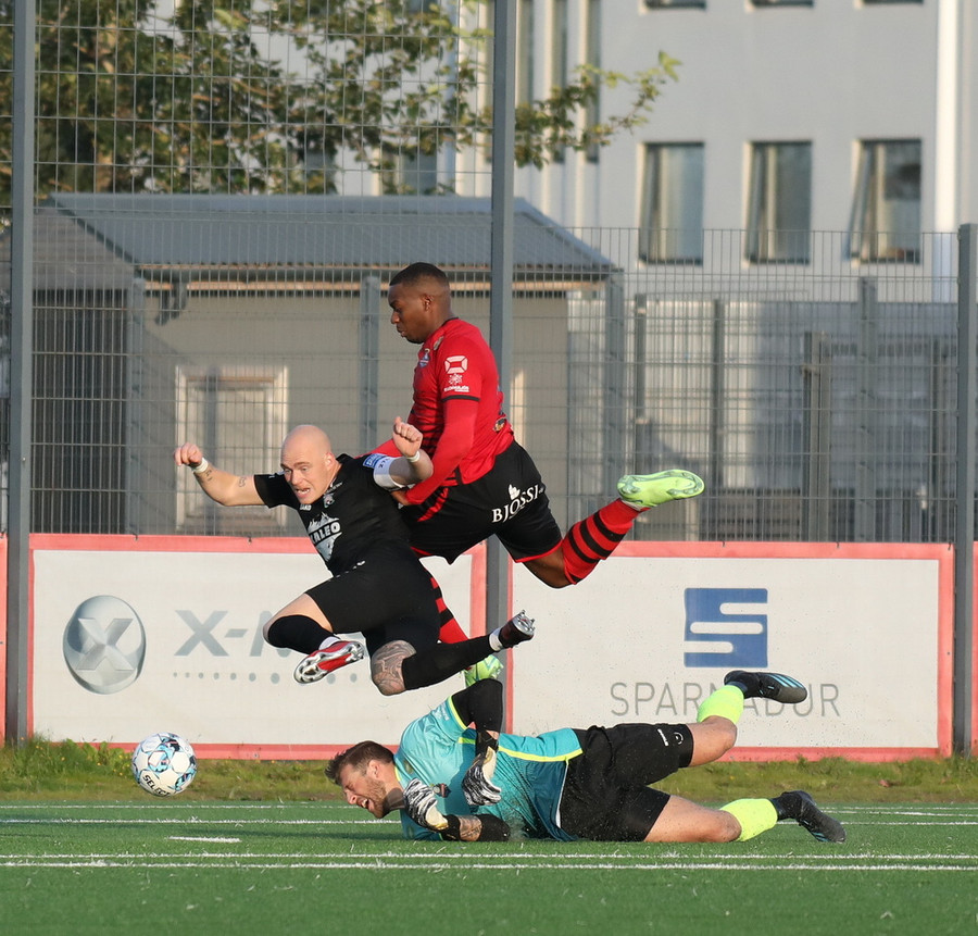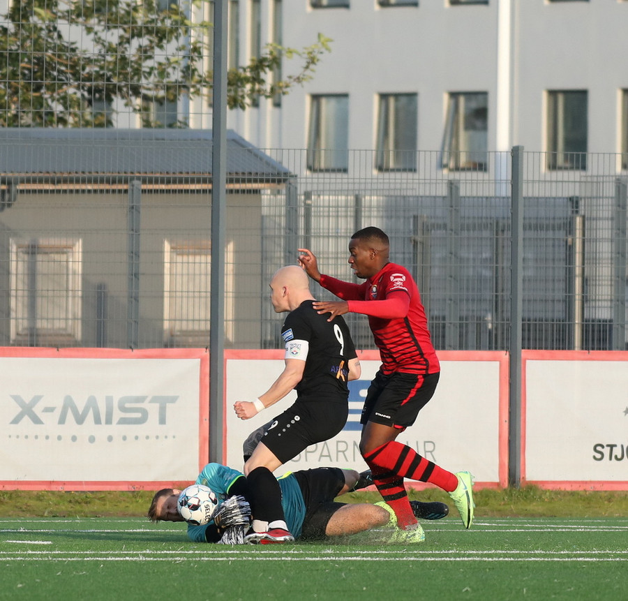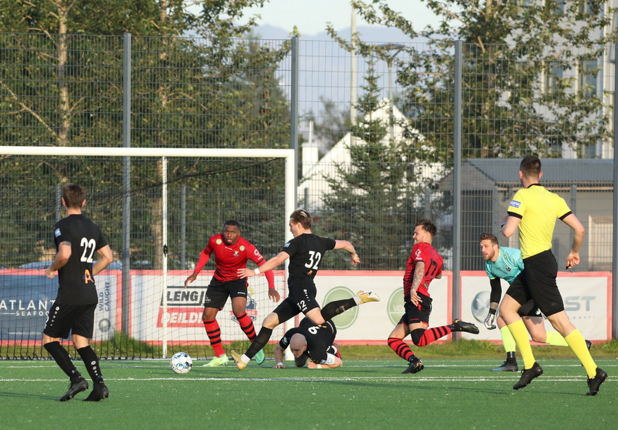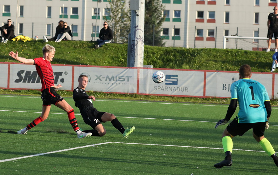 Davíð Þór stelur boltanum af Pedro sem rúllar honum svo inn fyrir vörnina á Hákon en skotið hans fer framhjá
