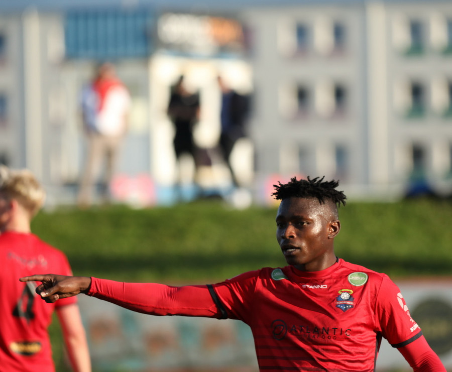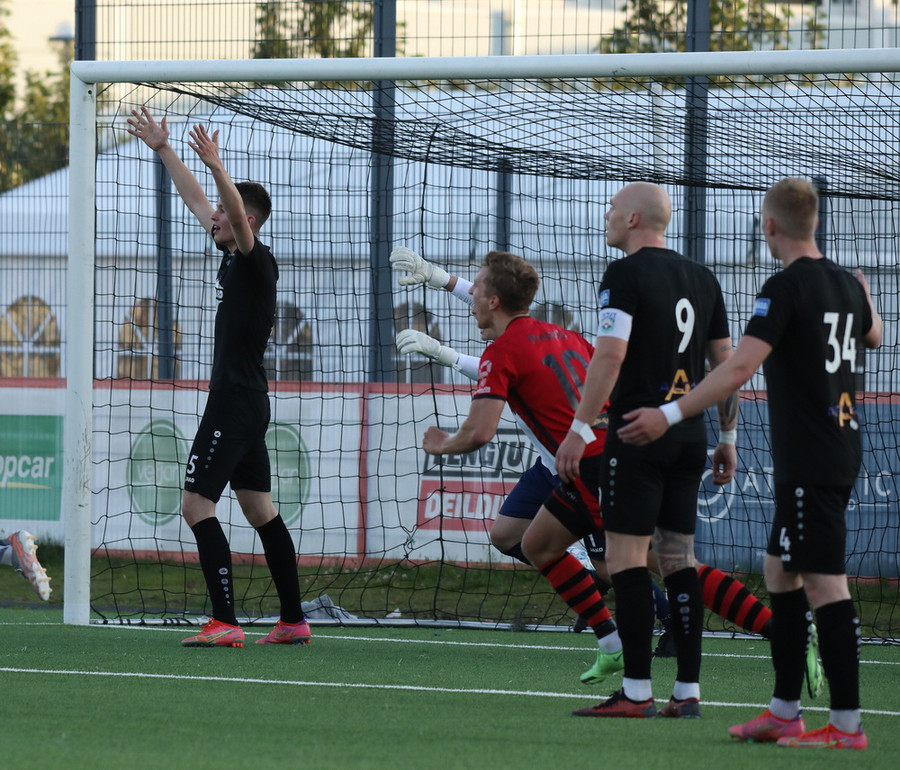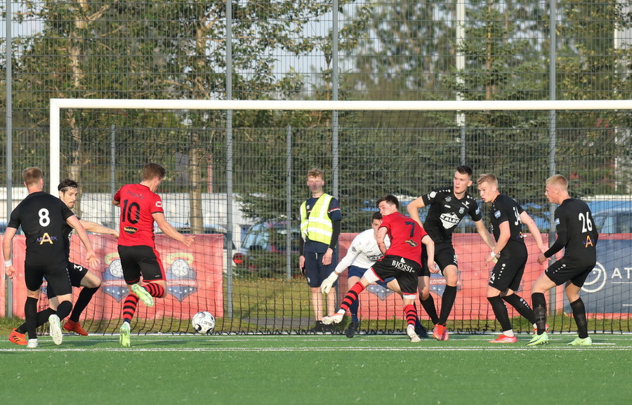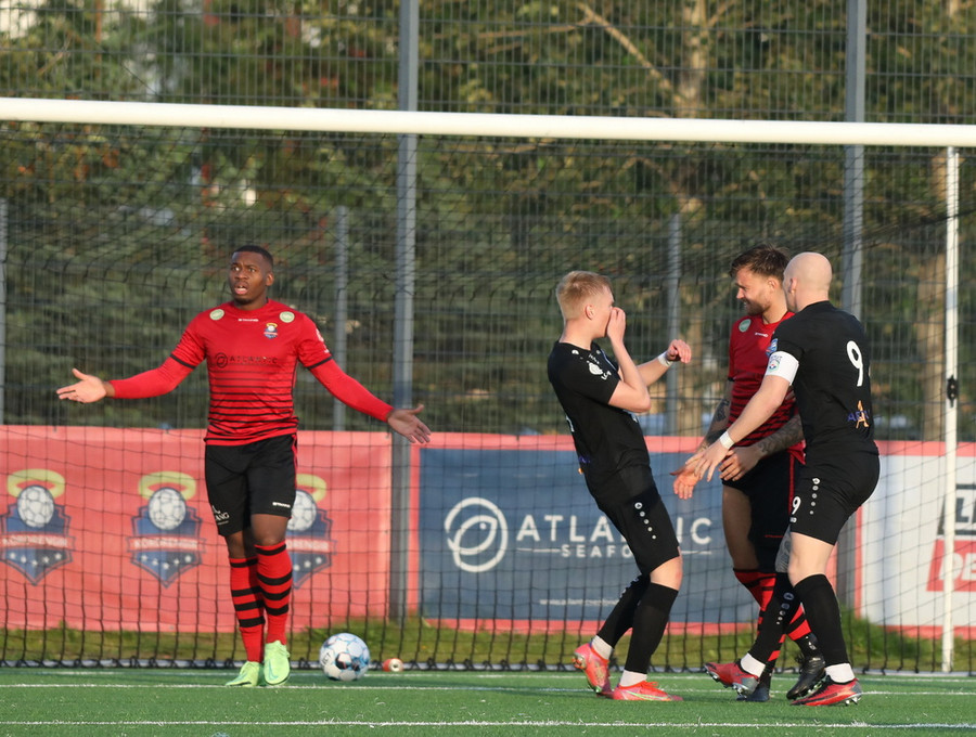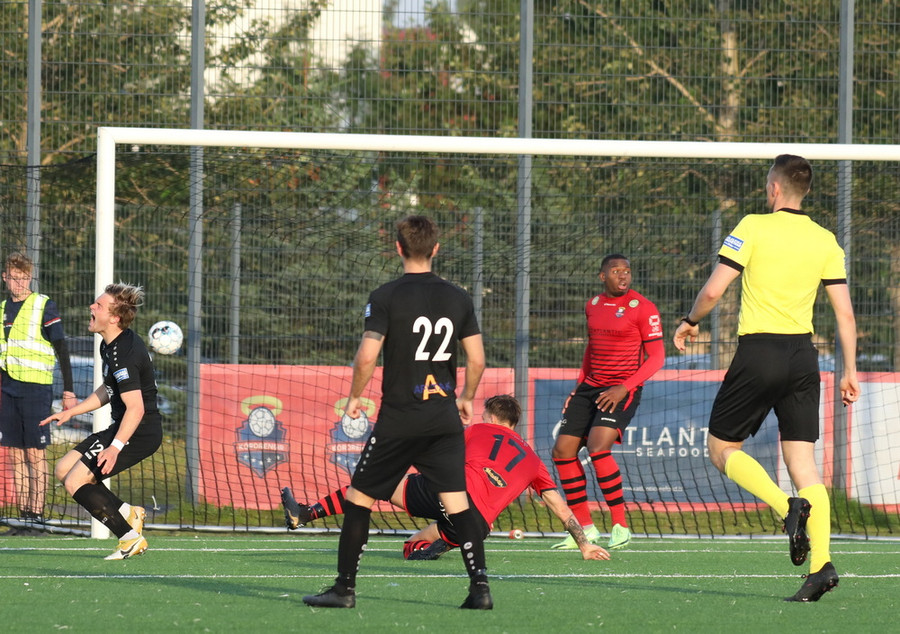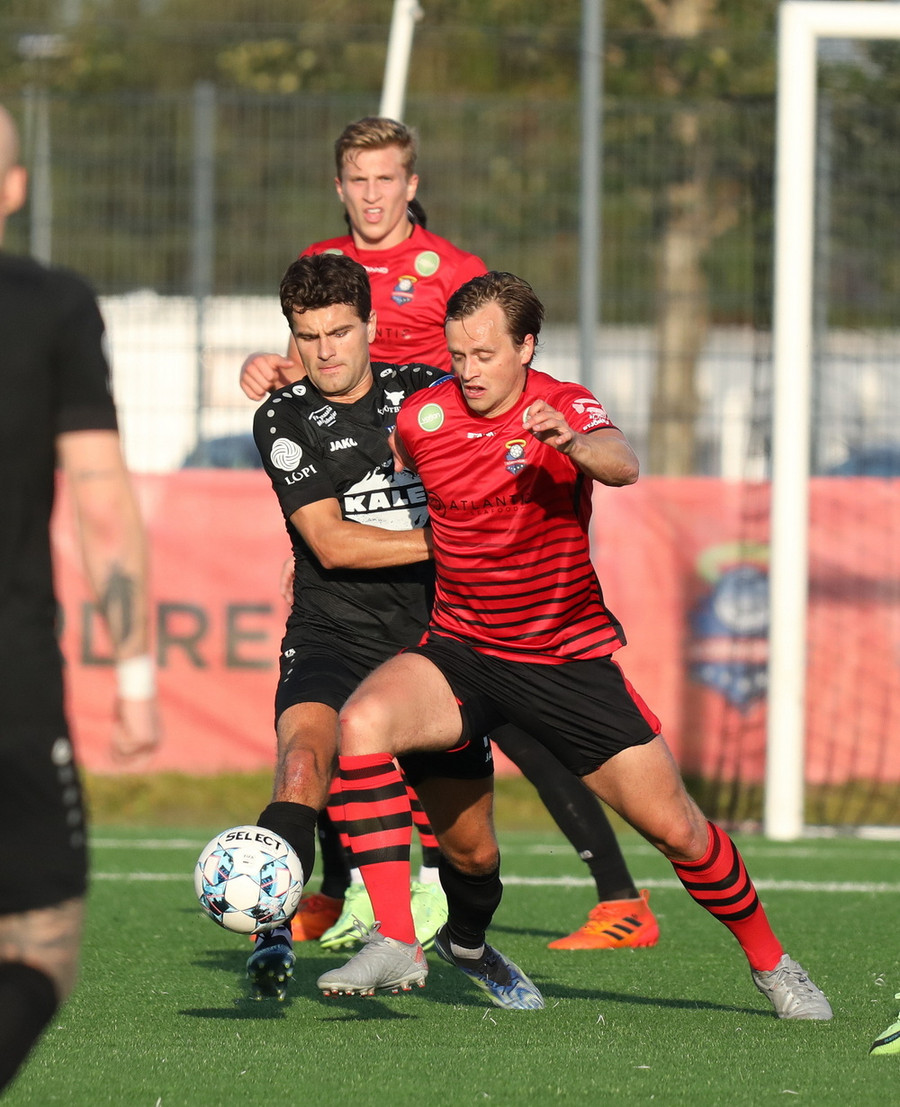 Davíð Þór stelur boltanum af Pedro sem rúllar honum svo inn fyrir vörnina á Hákon en skotið hans fer framhjá