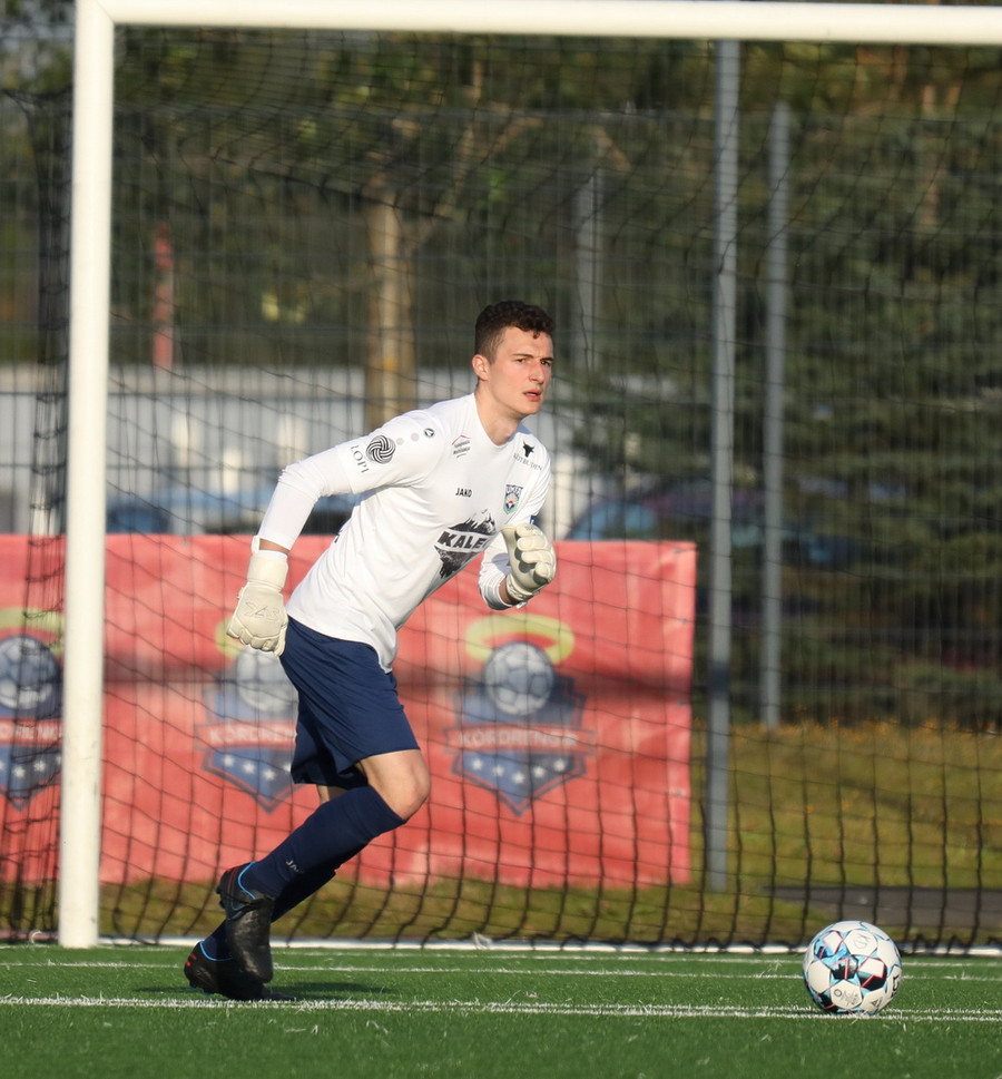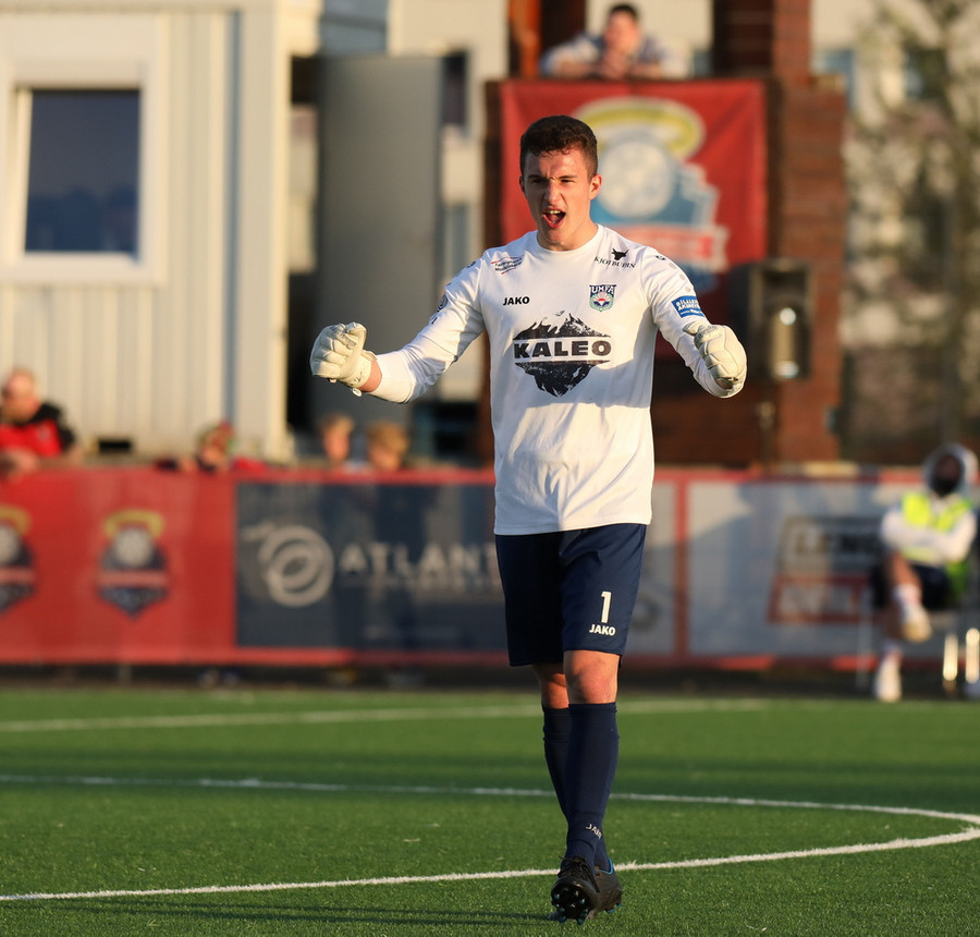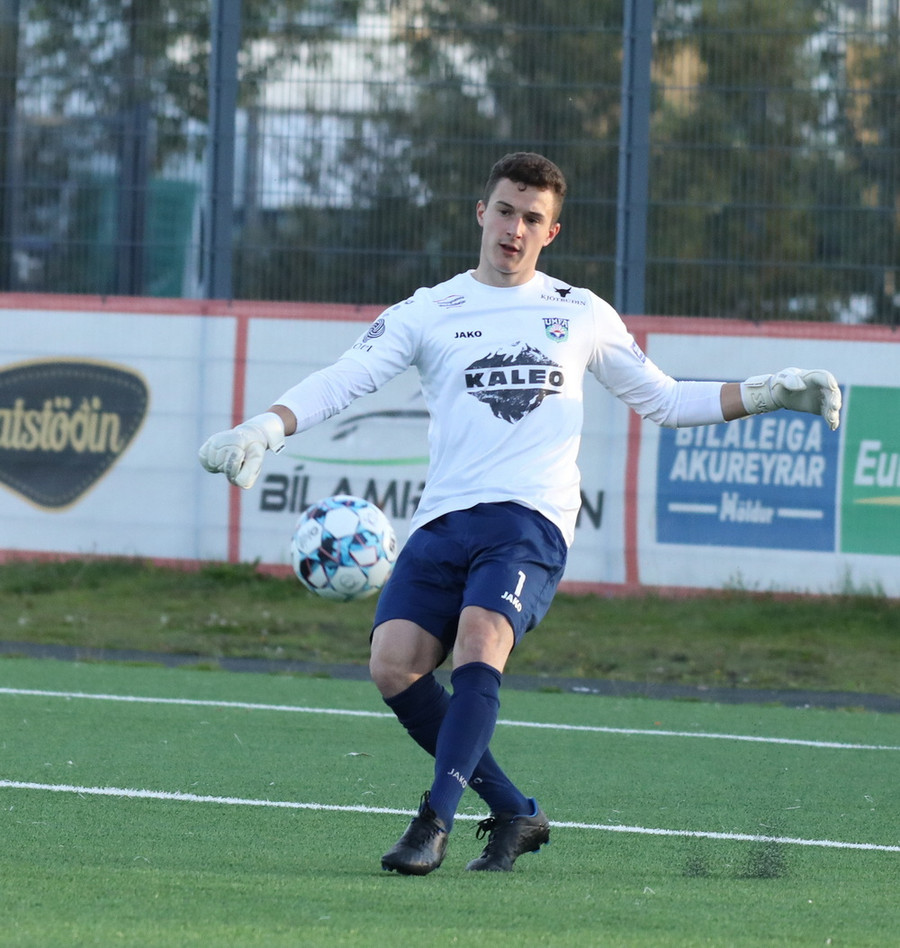 Pedro leitar inn á völlinn en finnur ekkert sem honum líst á þannig hann kemur með bolta inn í teig frá miðlínu sem ratar beint á Alexander í markinu.