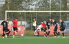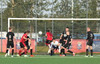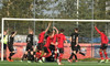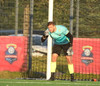 Hornspyrna heimamanna er á leiðinni á markið en Tanis gerir vel og slær hann frá.