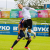 Jónatan tekur spyrnuna en Danni Finns stekkur manna hæst í teignum og stangar boltann frá!!