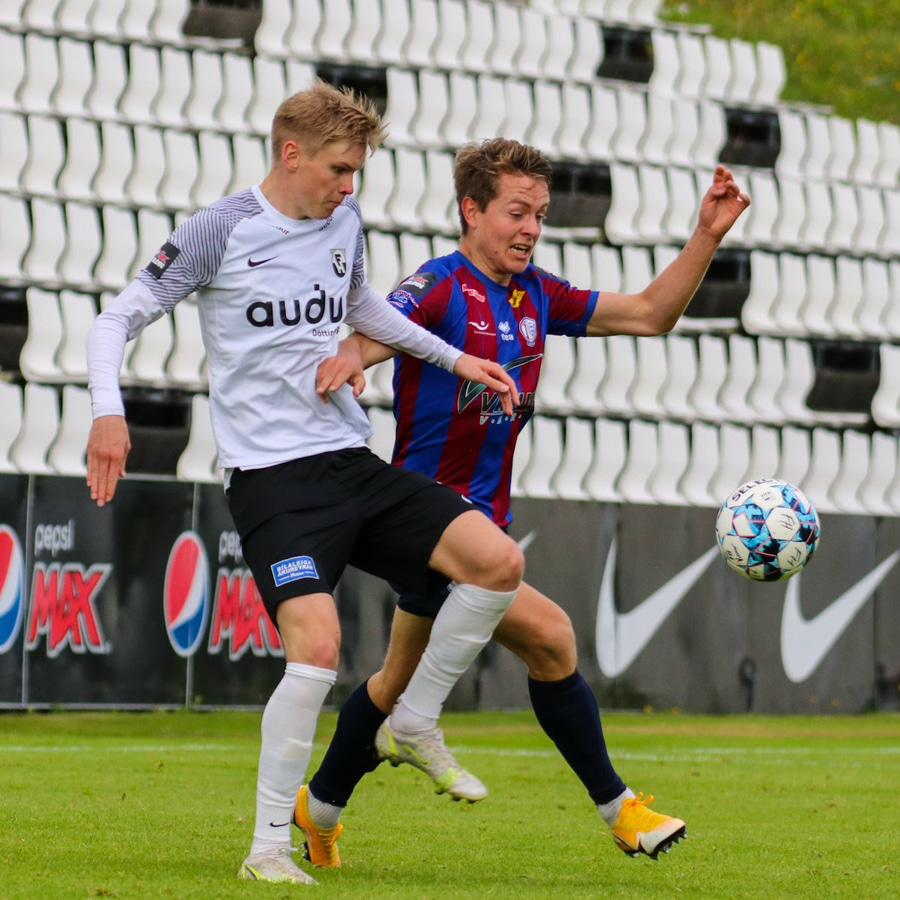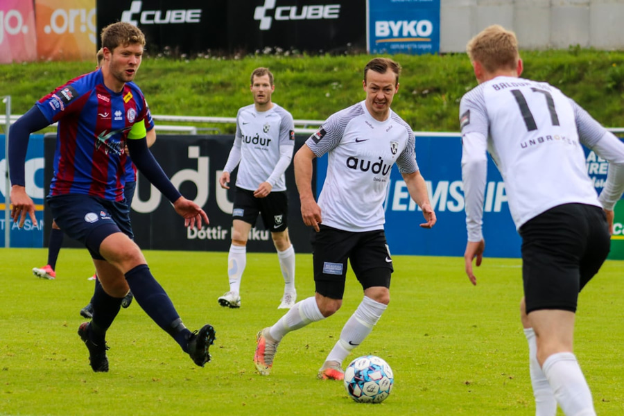 Hörður Ingi vinnur boltann frábærlega af Degi Austmann á vallarhelmingi Leiknismanna!