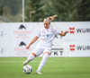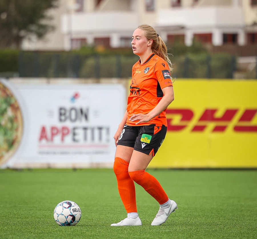 Shaina Ashouri með skot að marki úr aukaspyrnu fyrir utan teig en beint á Tinnu Brá sem greip boltann.