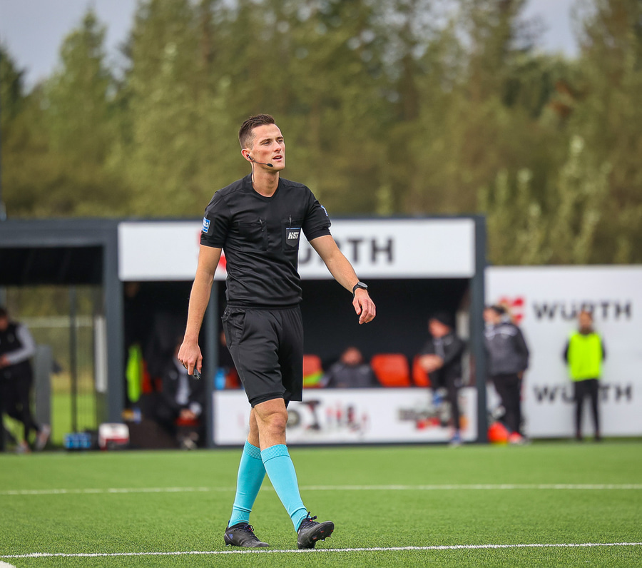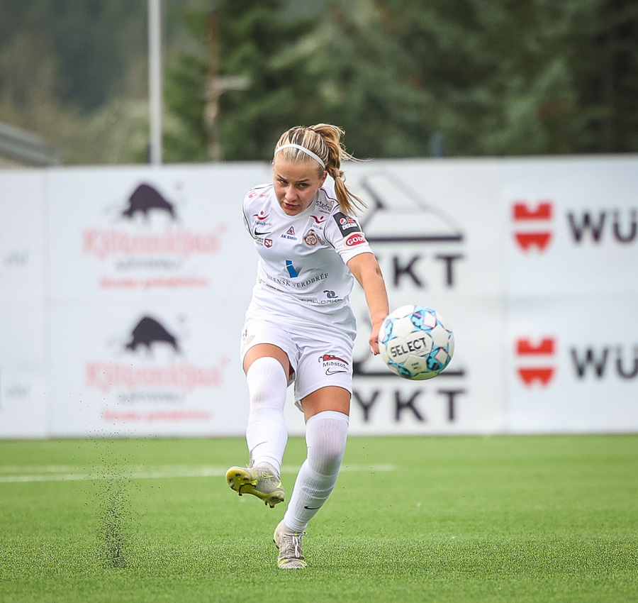 Sparkaði boltanum í burtu eftir að búið var að flauta hendi á Margréti Árnadóttur í teignum.