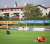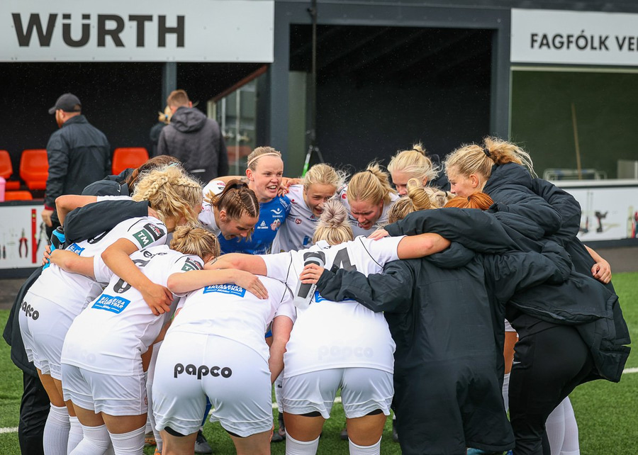 Leikurinn er hafinn. Þór/KA byrjar með boltann og spilar í átt að sundlauginni.