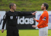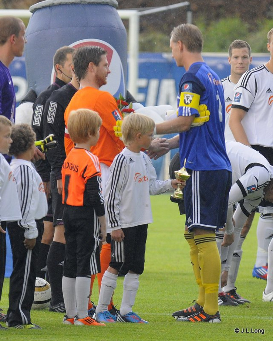 Gunnleifur Gunnleifsson, fyrirliði FH, gefur Bjarna Guðjónssyni blómvönd fyrir leik. FH-ingar að óska KR-ingum til hamingju með bikarmeistaratitilinn. Sálfræði? Þá er Freyr Bjarnason verðlaunaður fyrir að vera orðinn leikjahæsti leikmaður FH frá upphafi í efstu deild.