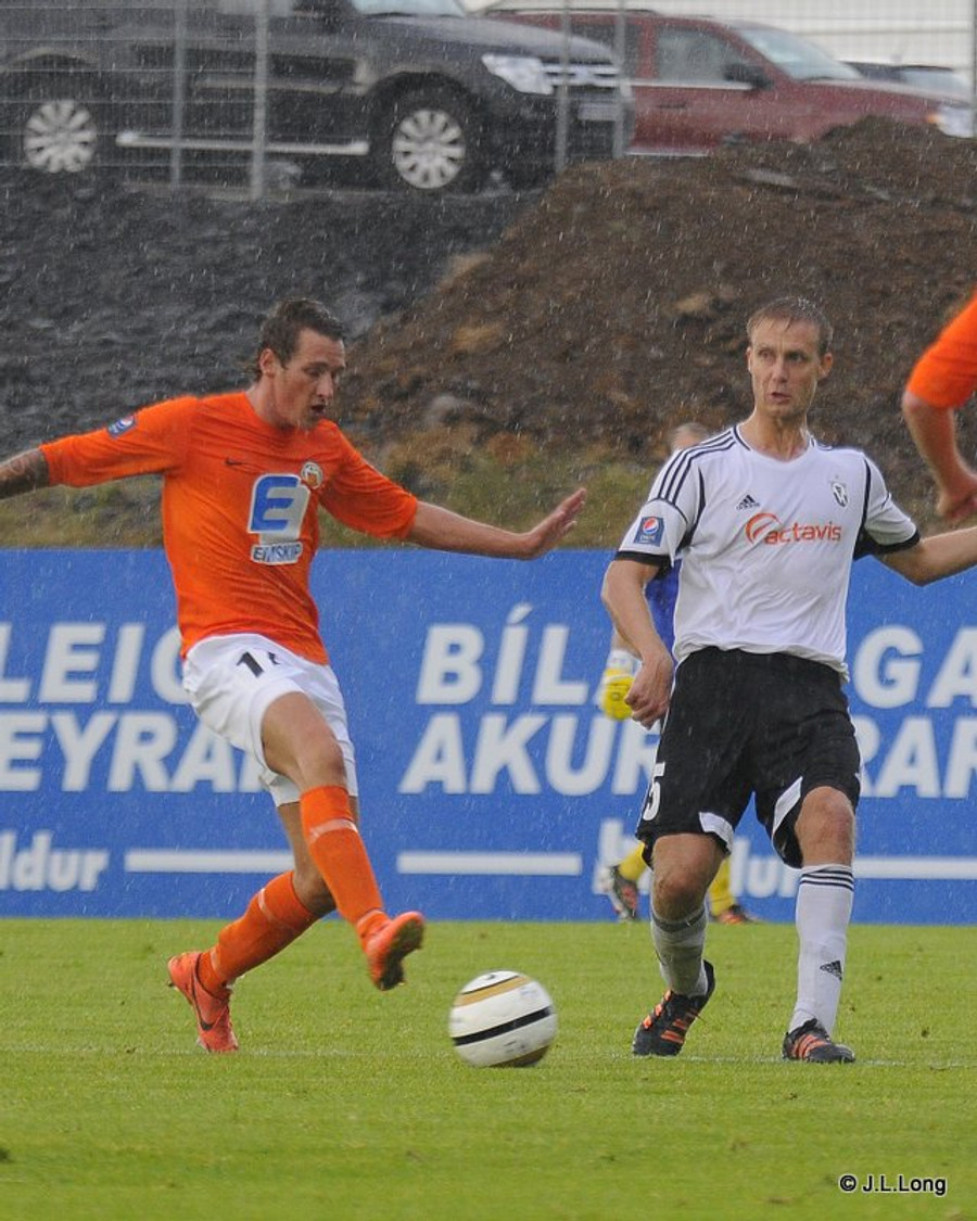 Þessi leikur byrjar fjörlega. Mikil rigning og blautur völlur. Nóg að gerast og harkan mikil. Miðað við Twitter eru flestir á því að Bjarki Gunnlaugs hefði átt að fá rautt áðan. Ekkert sjónvarp í blaðamannastúkunni svo maður fær engar endursýningar.