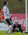 Atli Guðnason í fínu færi en Hannes varði. Atli varla náð að vera skugginn af sjálfum sér í kvöld.