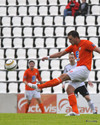 SKOT Í SLÁ! Bjarni Guðjóns með skot úr aukaspyrnu sem fer í þverslánna. Gunnleifur grafkyrr í markinu.
