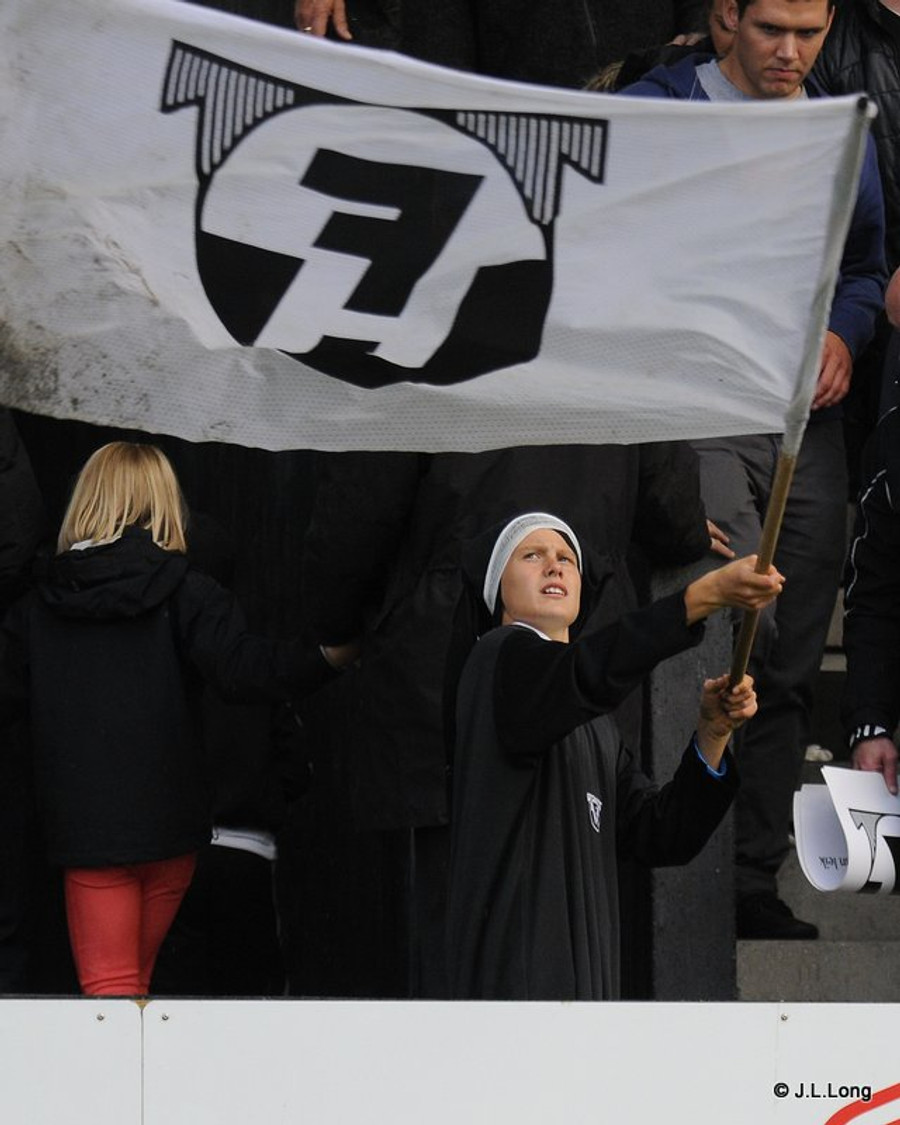 FH-ingar eru í hátíðarskapi. Þeir eru að frumsýna nýja lukkununnu sem sveiflar fána við hliðarlínuna. Svo verður nýtt stuðningsmannalag frumflutt rétt fyrir leik. Voða fínt.