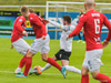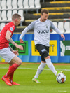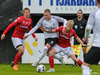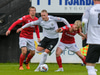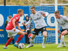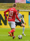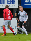 Tryggvi Hrafn með boltann úti vinstra megin og rennir honum á Aron sem á skot sem varnarmenn FH komast fyrir.