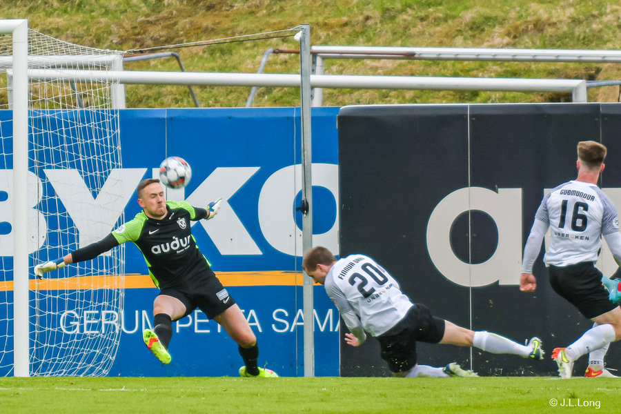 Góð skipting út á Ástbjörn úti hægra megin en fyrirgjöfin frá bakverðinum beint í hendurnar á Guy.