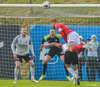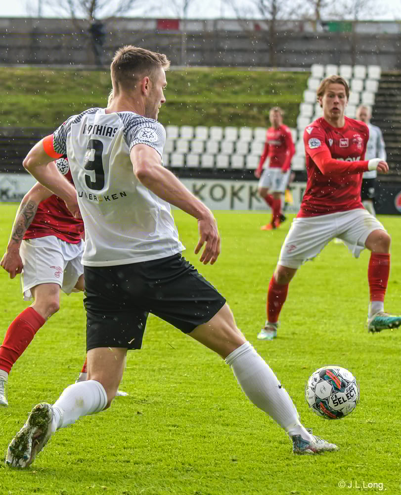 Boltinn fellur til Matthíasar inn á vítateig Vals, örlítið hægra megin, og hann skorar með skoti með hægri fæti sem fer í fjærhornið framhjá Guy í markinu.