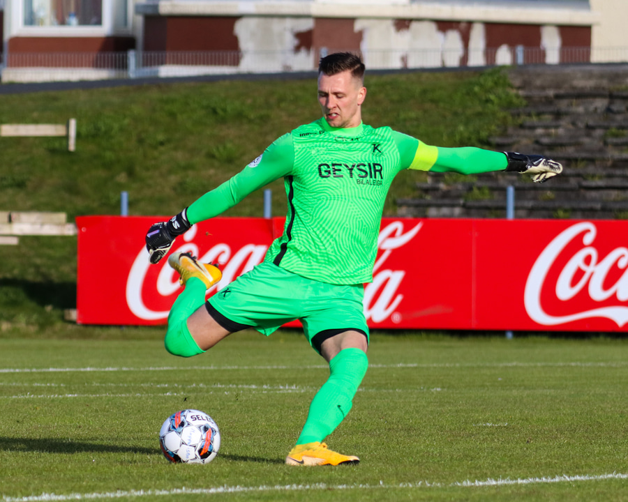 Gibbs fær boltann við vítapunkt og lætur vaða niður i hornið hægra megin, Viktor snöggur niður og ver boltann en heldur honum ekki. Adam Ægir reynir við frákastið en Viktor kastar sér á boltann og nær honum á undan.