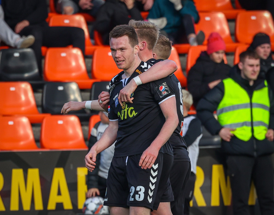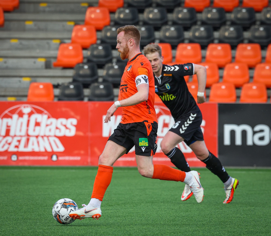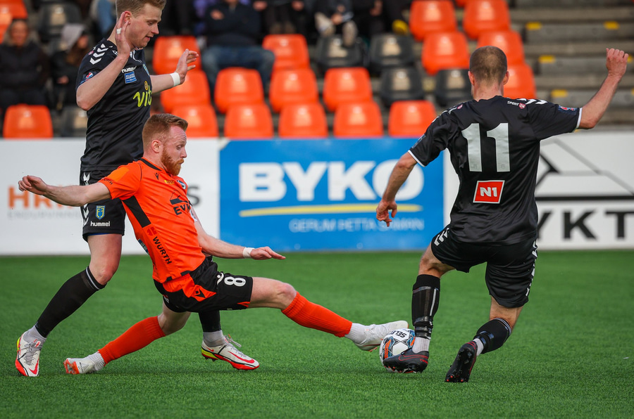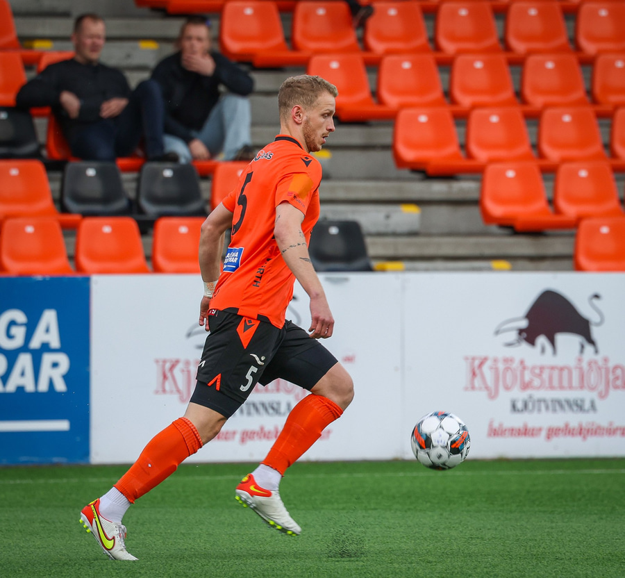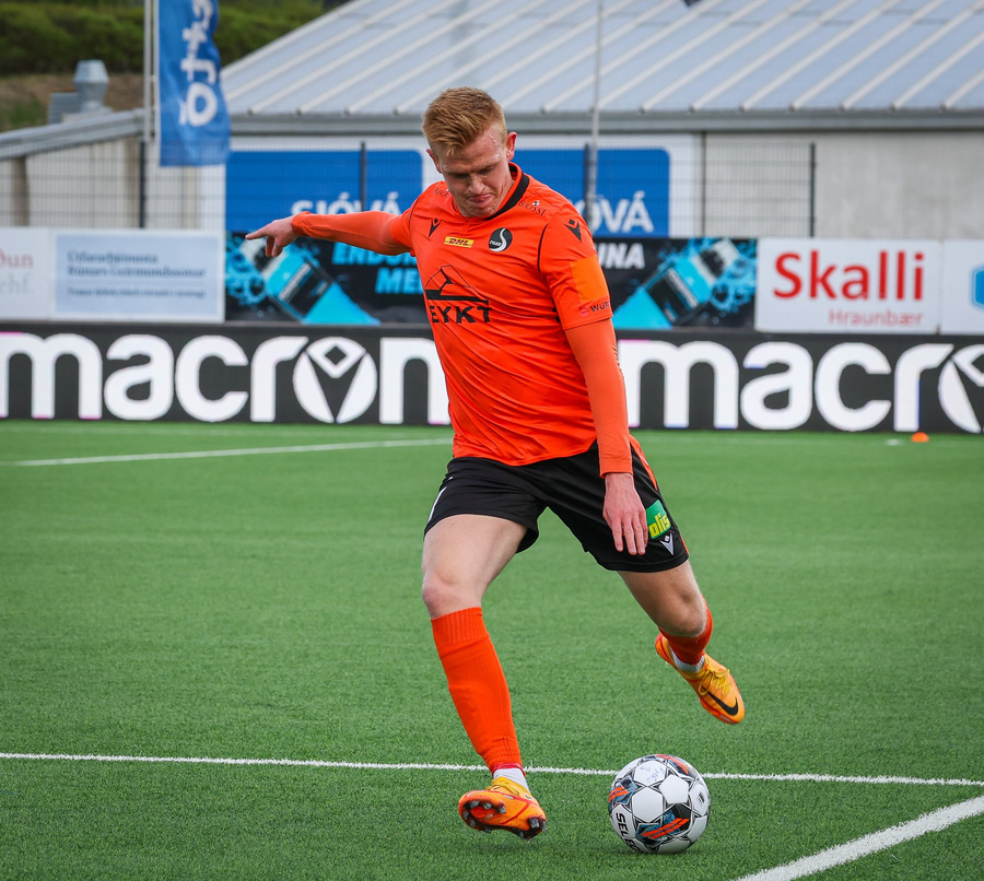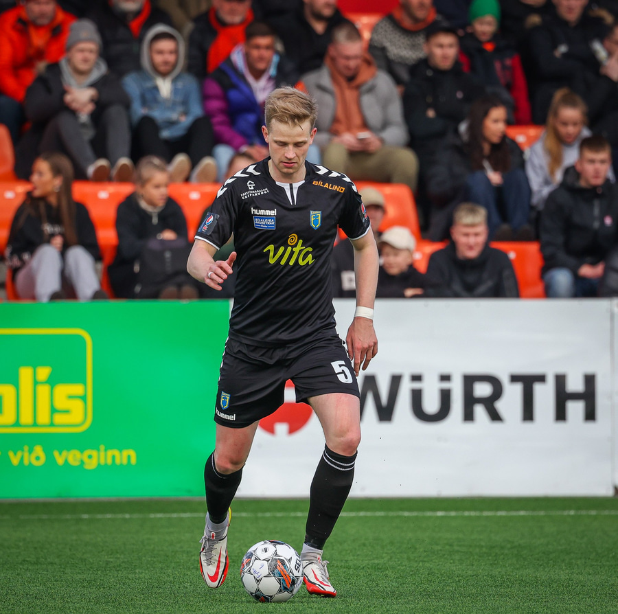 Vilhjálmur Yngvi með boltann hægra meginn og kemur með baneitraða fyrirgjöf fyrir þar sem Hákon Ingi stangar hann inn.
