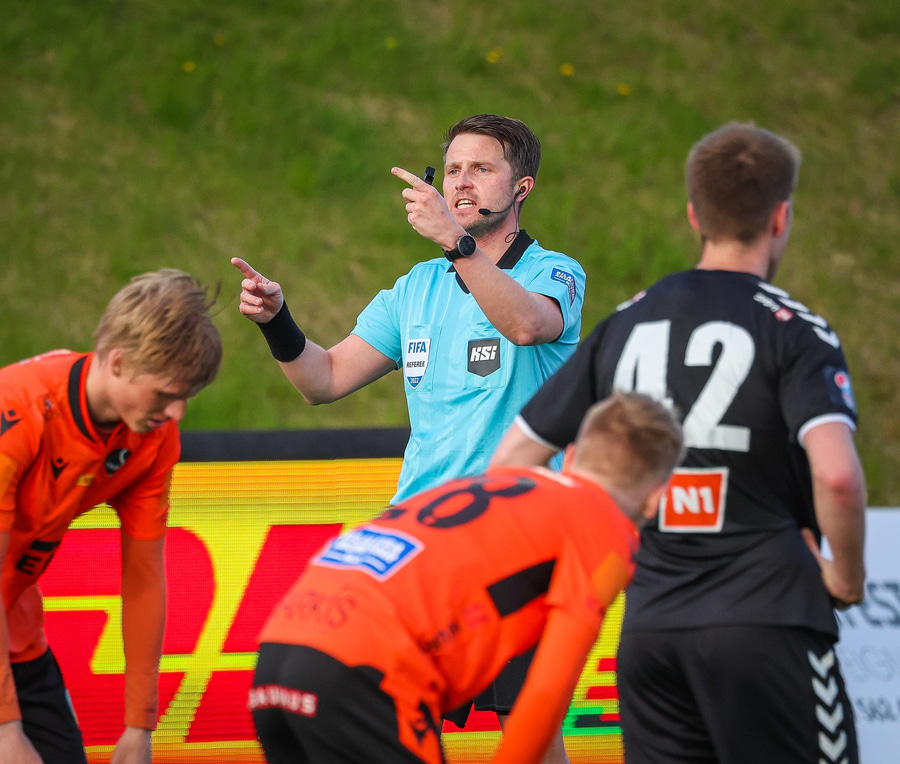Nikulás Val er með boltann hægra megin í teignum og setur boltann þvert yfir teiginn á Benedikt Daríus sem er í dauðafæri einn gegn Sigurjóni en setur hann yfir.