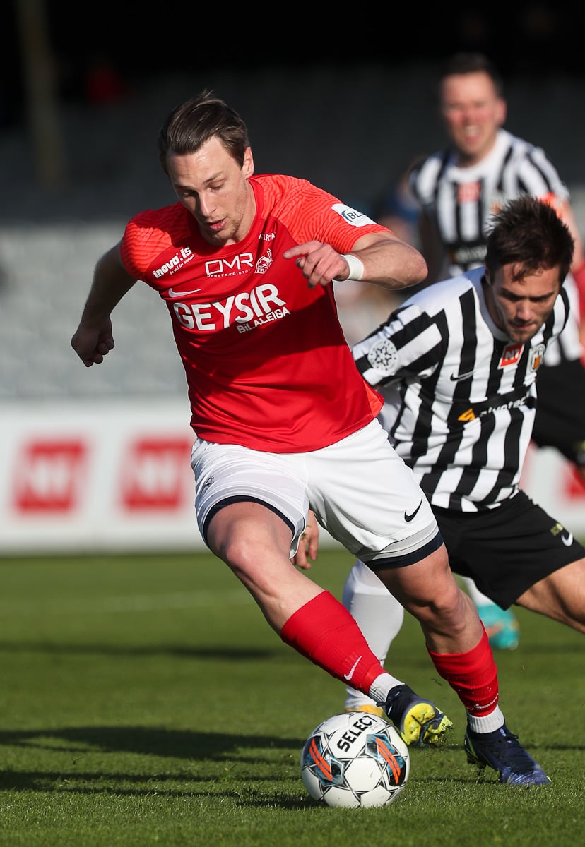 Grétar með lausan bolta til baka á Beiti og Ivan sprettar á eftir honum.