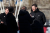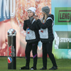 Þá rölta leikmenn inn á völlinn í fylgd dómarans og besta stefið í fullum gangi. Þetta fer að byrja.