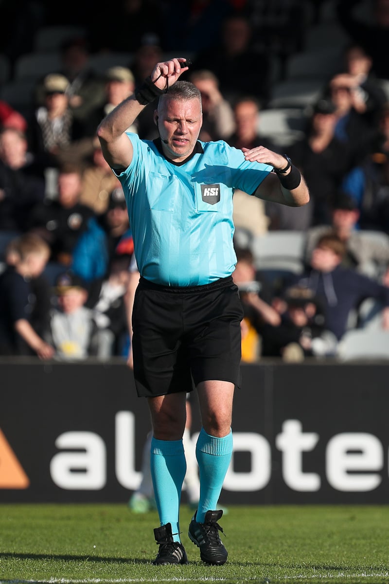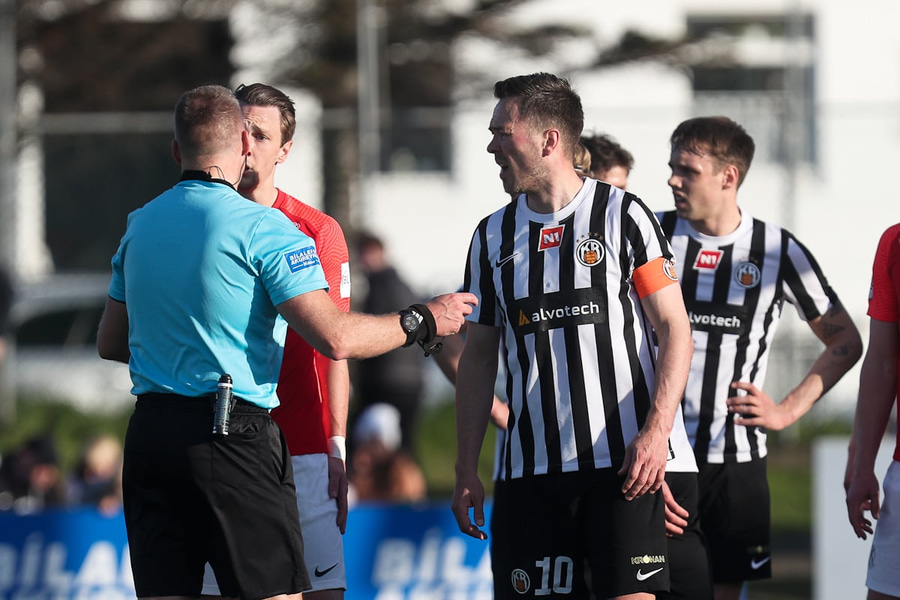 Kiddi Jóns var sloppinn einn á móti markmanni en Pétur dómari dæmir hendi á hann.