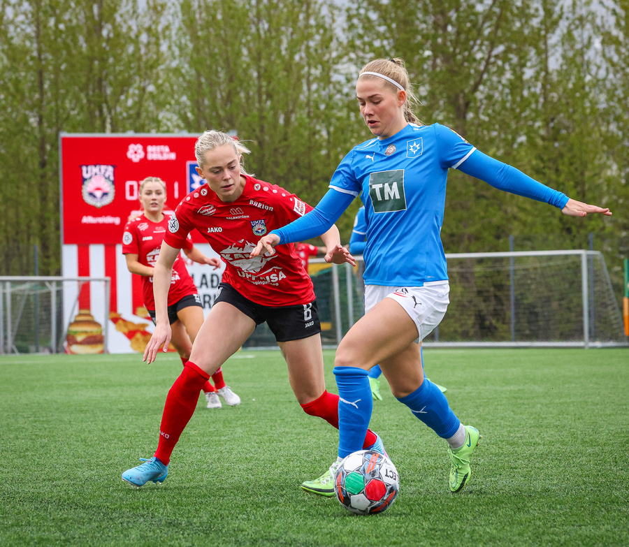 Katrín Ásbjörns með sendingu á Jasmín sem snýr af sér varnarmann en nær ekki skoti.
