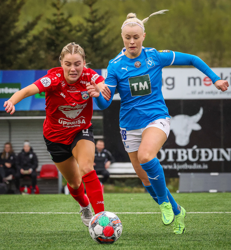 Birna Kristín með fyrirgjöf á Kristín Þóru sem nær skoti beint á Chante og engu munaði að hún hefði misst boltann í gengum klofið!