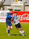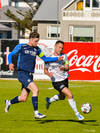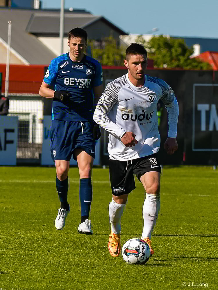 Kristinn Freyr að koma sér í álitlega stöðu inn á teig Keflavíkur en rekur hendina í andlit Ernis og dæmdur brotlegur.