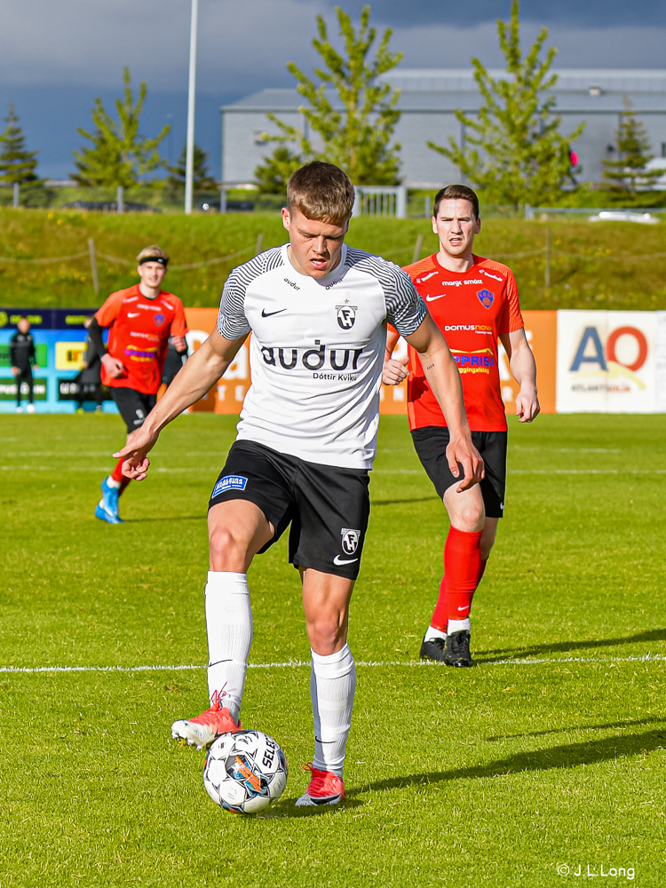 Haraldur Einar vinnur boltann úti vinstra megin og sendir fyrir á Lennon sem hittir ekki boltann með vinstri... kjörið tækifæri.