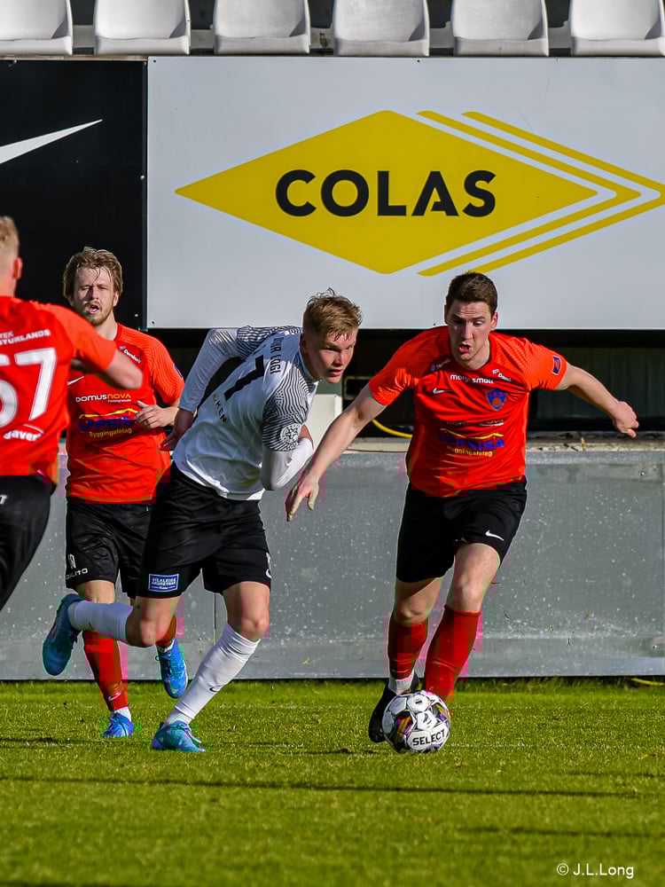 Haraldur leggur boltann út á Lennon sem er með boltann á vinstri en neglir í varnarmann.