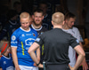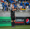 Tiago fór auðveldlega niður fyrir utan teig. Framarar í stúkunni baula og vilja aukaspyrnu en Elvis hreinlega skammar Tiago fyrir dýfu.