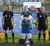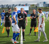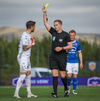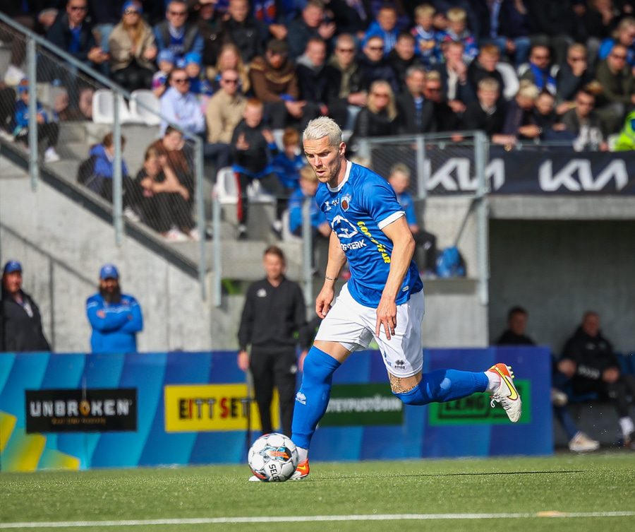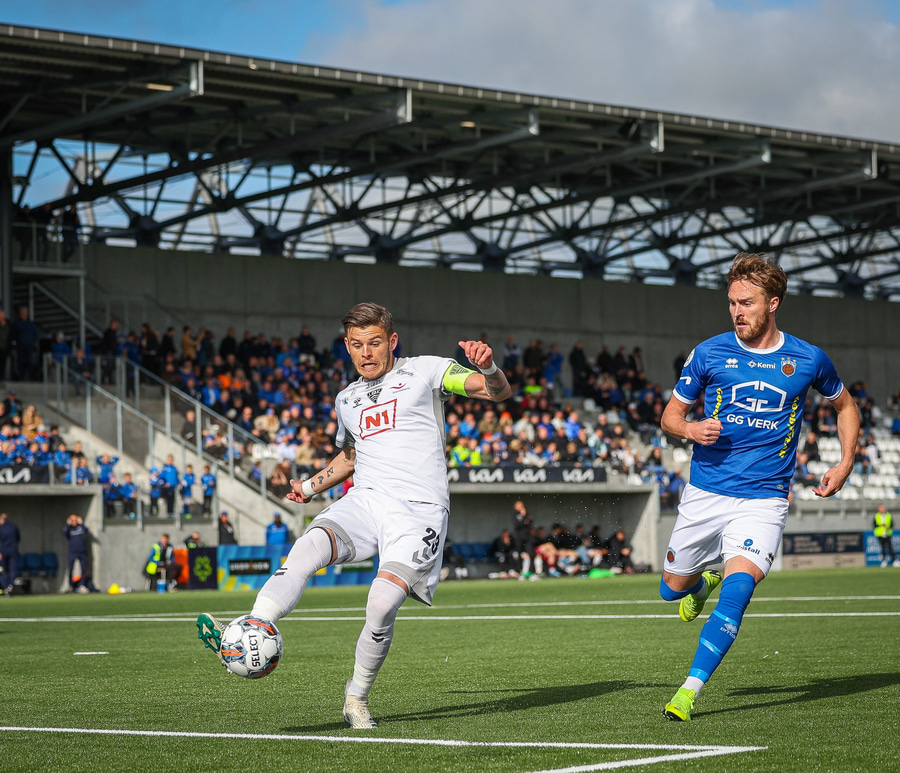 Fyrsta mínútan á nýja vellinum!!! Skyndilega er Andri Rúnar kominn í gegn og Óli Íshólm brýtur á honum!