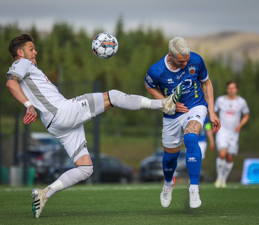 Gummi Magg henti sér svo í svakalega tæklingu á Guðjón Erni og uppskar gult spjald.