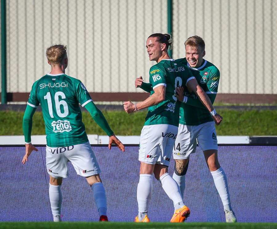 Dagur Dan er fyrir utan teiginn, gefur á Oliver sem gefur á Ísak sem gefur boltann á Jason og Jason á skot sem fer í Arnór Svein og lekur þaðan í fjærhornið í stöngina og inn!!!