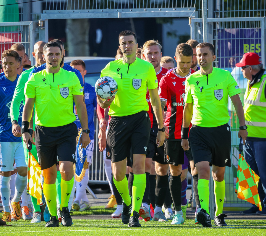 Juxhin Xhaja dæmir leikinn hér í kvöld og verður hann með þá Dojando Myftari og Nertil Bregasi. Cjapi Kreshnik sér um skiltið á hliðarlínunni.