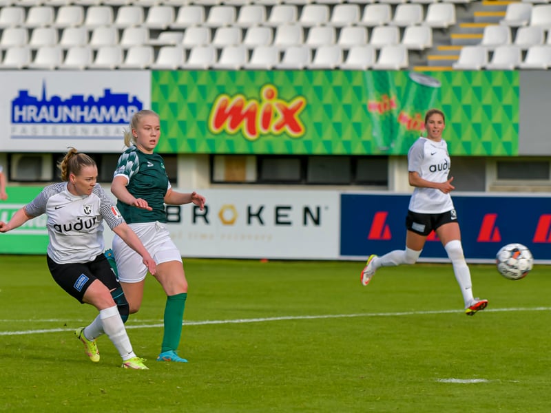 Sunneva með boltann fyrir og Rannveig - sýnist mér - nær góðum skalla en Herdís Halla er í banastuði og vera frábærlega!