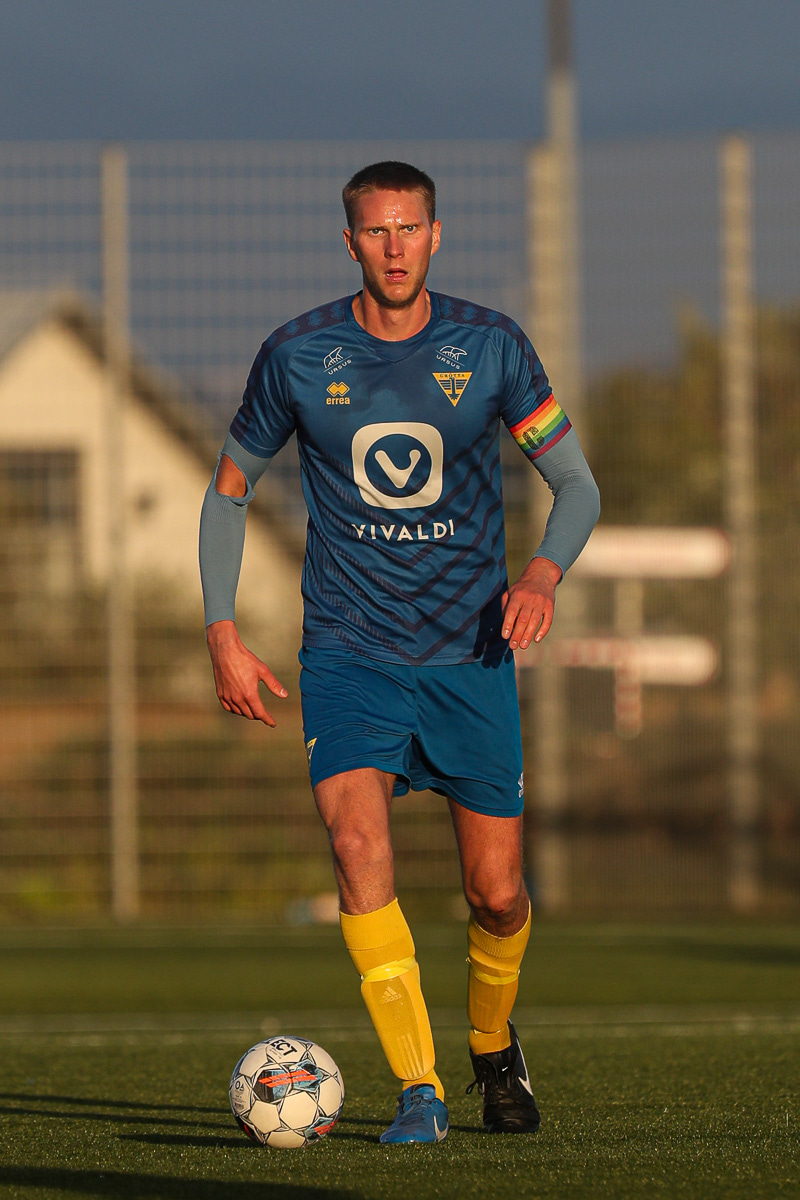 Esteve Pena fer í enn annað skógarhlaupið og er of seinn til boltans hægra megin í teignum.