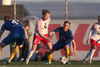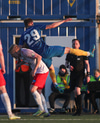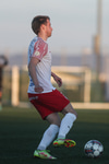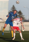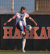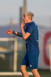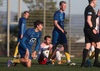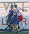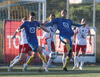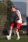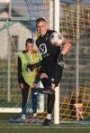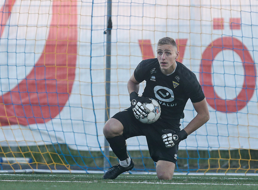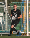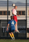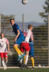 Kjartan með spyrnu beint á Auðunn í markinu. Boltinn skoppar af Auðunni, en hann nær svo í boltann eftir á.