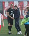Fær seinna gula spjaldið fyrir að kjafta við dómaran. Veit ekki hvað var sagt á milli þeirra, en að mögulega aðeins of strangur dómur.