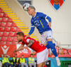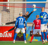Aron finnur Hauk inn á teignum og fyrirliðinn á lausan skalla sem Ólafur ver - handsamar boltann.