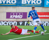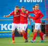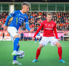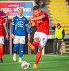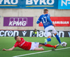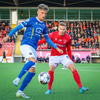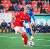 Flott spil hjá Fram, Indriði laumar boltanum inn fyrir í hlaupið á Tiago en Frederik sér við Tiago. Fram á horn.