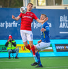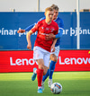 Guðmundur gerir vel og kemur sér í fínt skotfæri utarlega í teignum, hann lætur vaða en Frederik ver boltann aftur fyrir.