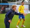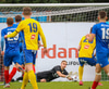 Sigurjón gerir virkilega vel hérna eftir að að það kemur stungusending inn fyrir og Sigurjón helypur langt út úr markinu og er rétt á undan Luke Rae og nær að hreinsa boltan.
