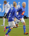 Hörður Árnason með skalla eftir horn en Hólmar Örn Rúnarsson bjargaði á marklínu! Frábær byrjun á leiknum. Þetta verður fjör.