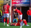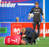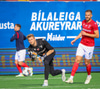 Jajalo situr í marki KA og þarf aðhlynningu. Steinþór Már joggar í átt að bekk KA. Er hann að koma inn á?