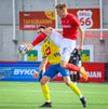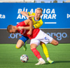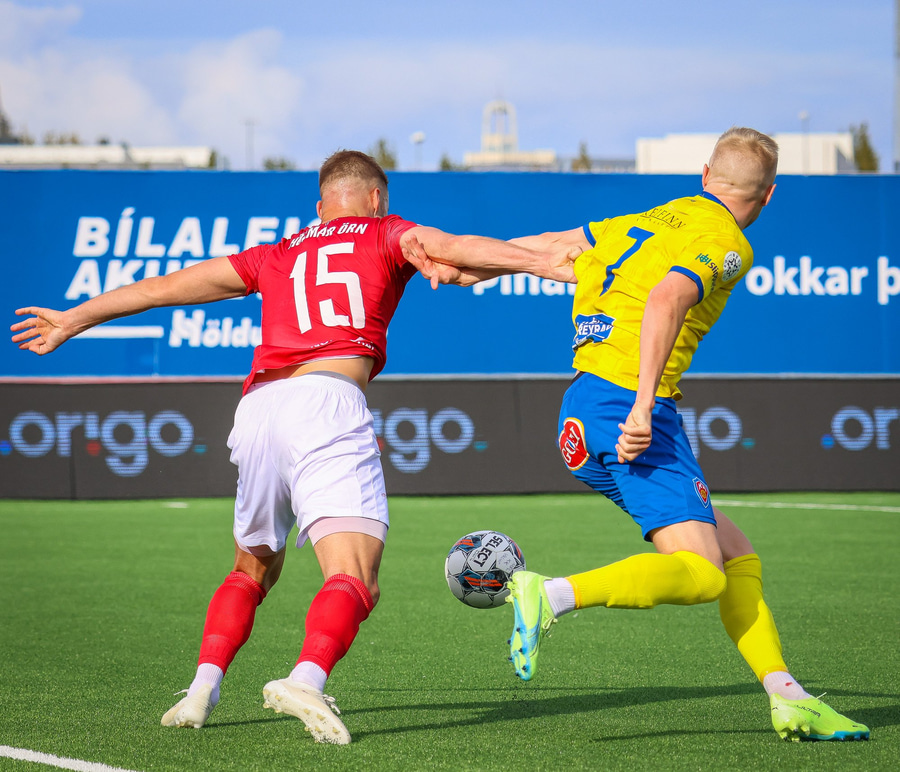 Gestirnir gera vel að vinna boltann inn á miðsvæðinu, Haukur Páll missir boltann og þarf að keyra til baka.