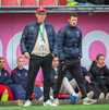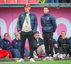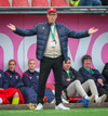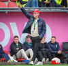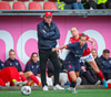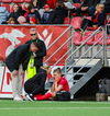 Pétur er ósáttur á hliðarlínunni. Vill meina að leikmenn Slavia séu að tefja eins og þær geta - sem þær eru að gera.